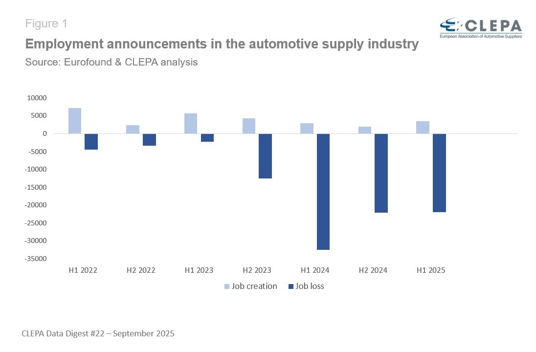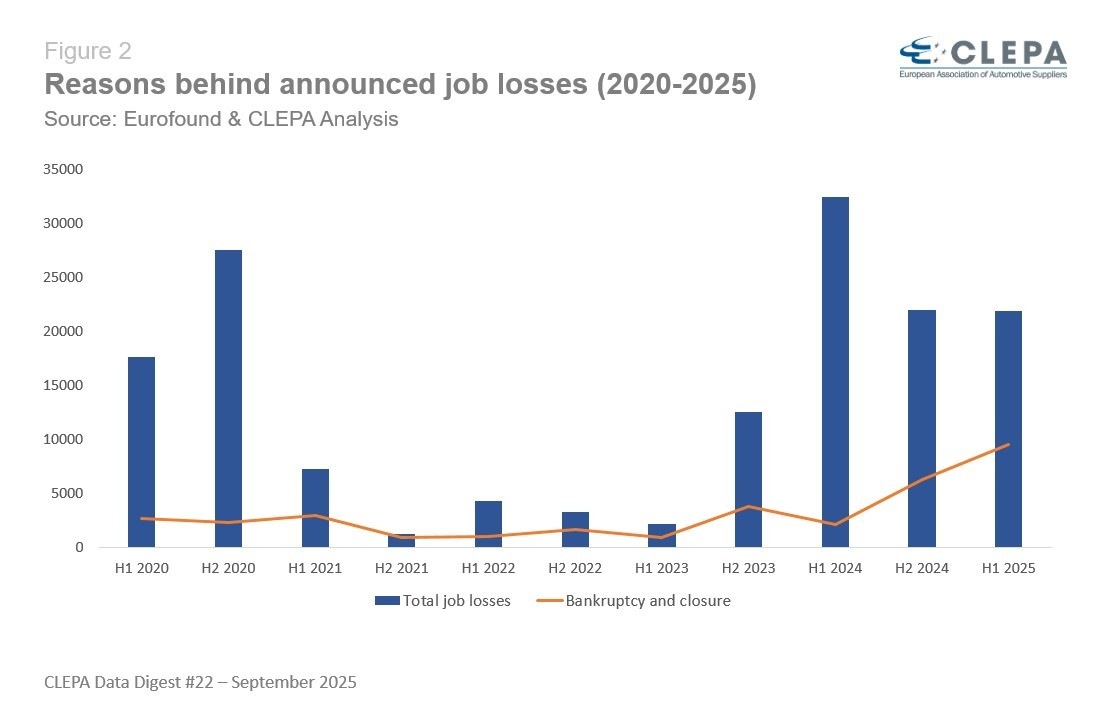 V letech 2020 až 2024 byla většina ztrát pracovních míst způsobena interní restrukturalizací, která představovala téměř dvě třetiny oznámených redukcí. Zavření podniků a bankroty hrály menší roli, a to 22 %. Tato rovnováha se v roce 2025 posunula. V první polovině roku dosáhly uzavření a bankroty 44 %, což představuje téměř 10 000 oznámených propouštění. Rostoucí podíl uzavření a bankrotů signalizuje zhoršující se podnikatelské klima a rostoucí strukturální tlaky na dodavatele.