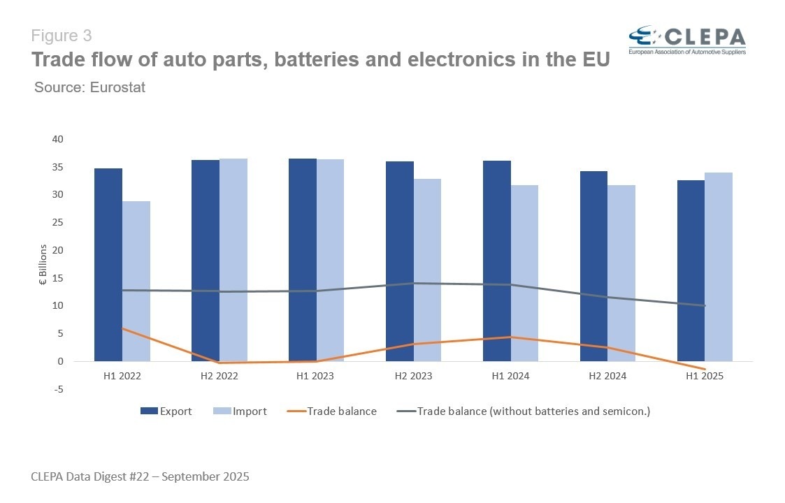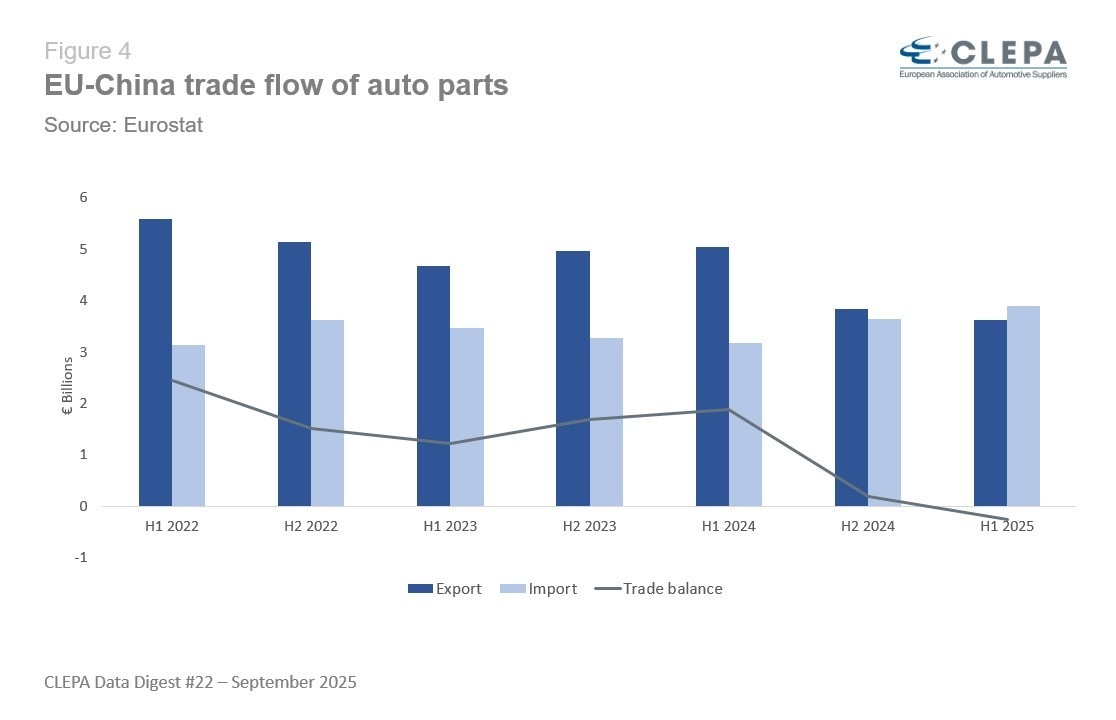 Zatímco na konci roku 2022 se EU blížila záporné obchodní bilanci, nyní se do ní jednoznačně dostala. Globální obchodní bilance EU v oblasti automobilových dílů, včetně baterií a elektroniky, se v první polovině roku 2025 propadla do deficitu ve výši 1,4 miliardy EUR, poté co v první polovině roku 2024 dosáhla přebytku ve výši 4,4 miliardy EUR.