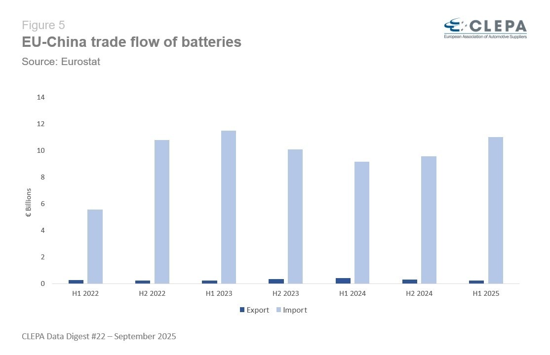 Obchod s bateriemi hraje stále větší roli: v první polovině roku 2025 dosáhl dovoz baterií do EU 11 miliard EUR, což je dvojnásobek oproti 5,5 miliardám EUR zaznamenaným ve stejném období roku 2022.