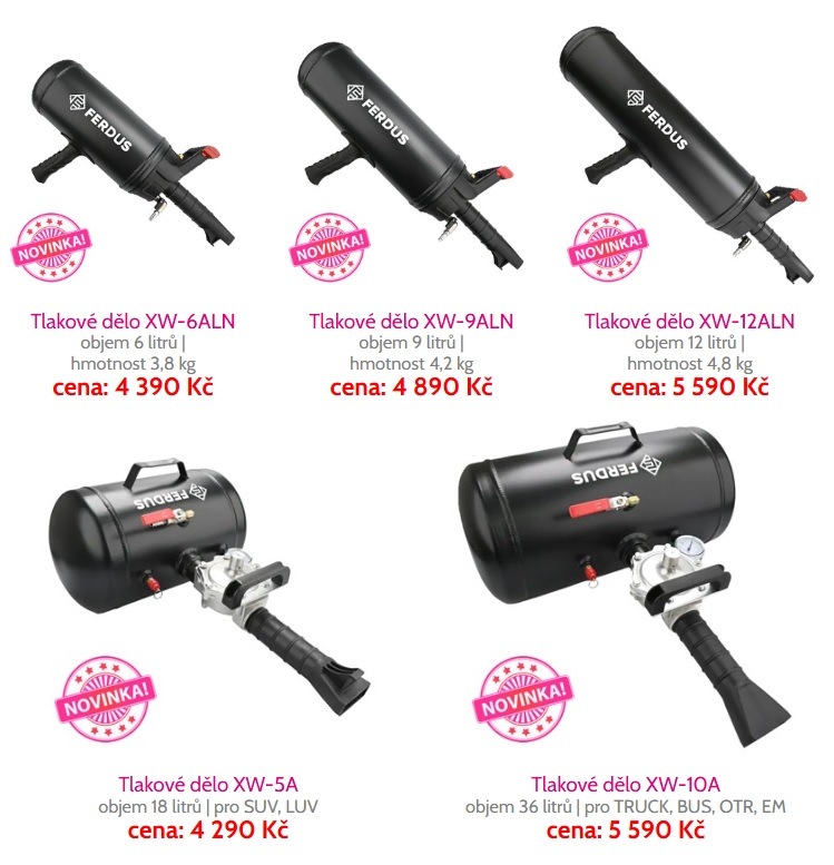 Na kategorii dodávek pak navazují děla XW-5A a XW-10A s kapacitou 18, respektive 36 litrů. Uplatnění najdou při servisu nákladních vozů, autobusů a prostředků EM/OTR. Pro nejvyšší model 10A tedy nejsou překážkou ani nadrozměrná nebo jinak atypická kola. Pokryté je zkrátka celé spektrum.