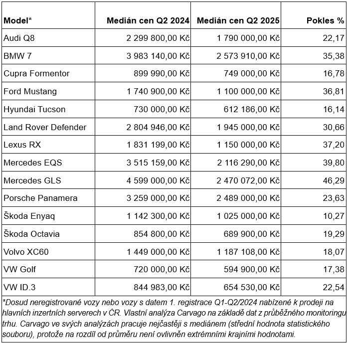 Nová analýza společnosti Carvago odhaluje, že během prvního roku dosáhne ztráta hodnoty zhruba 15 až 30 procent původní ceny, přičemž u některých prémiových modelů může být pokles ještě strmější. Analýza je unikátní v tom, že vychází nikoliv z oficiálních ceníkových cen, ale z reálných cen vozů nabízených k prodeji na hlavních tuzemských inzertních serverech, a to včetně již existujících skladových a předváděcích vozů. Meziroční pokles ceny je i tak dramatický.